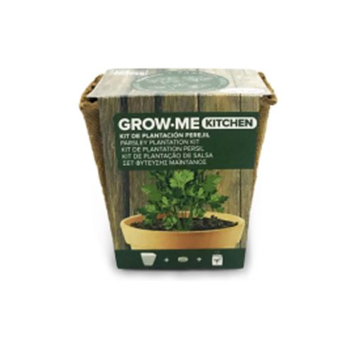 Kit de siembra de perejil gigante, con tiesto vegetal, disco de fibra de coco y sobre con semillas.