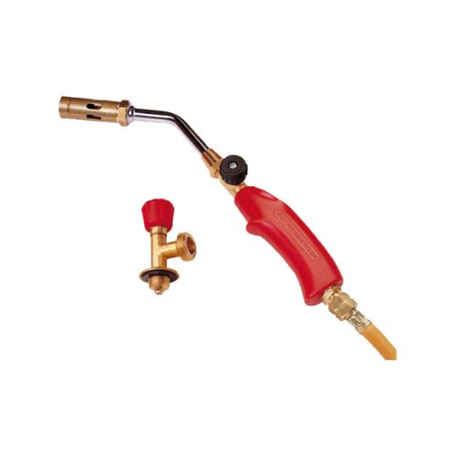 Soplete compuesto por mango con regulador, 2 metros de manguera de alta presión, quemador de 22 mm Ø y lanza de 100 mm. Conexión de salida W21,8. Incluye grifo para botella azul..