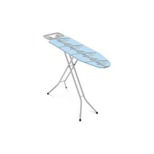 Plataforma recta en rejilla de 105 x 30 cm. Porta planchas de doble posición en chapa. Sistema progresivo de regulacion de altura de 60 a 90 cm. Patas de tubo reforzado de 19 mm sobre plataformas antideslizantes. Funda 70% algodón con aco lchado de espuma.