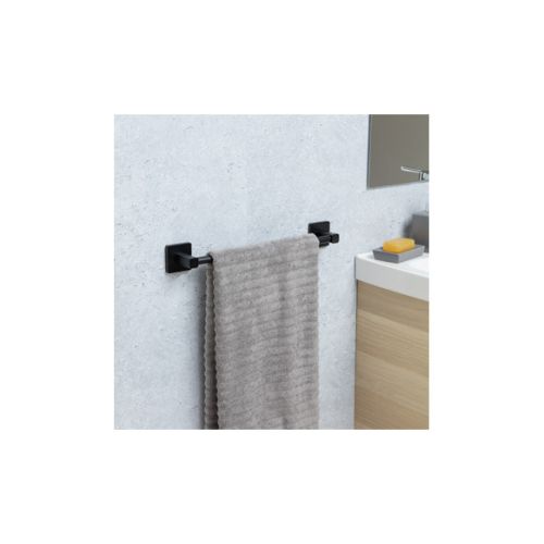 Toallero mediano fabricado en acero inoxidable y zamak en color negro mate, medi das: 6 x 6,5 x 45 cm, tornillos incluidos y sistema de fijación sin taladro de v enta por separado