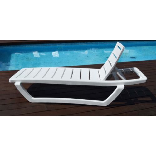 Estructura fabricada en polipropileno inyectado. Apilable. Respaldo abatible con 6 posiciones. Color blanco. 190 x 65 x 33 cm