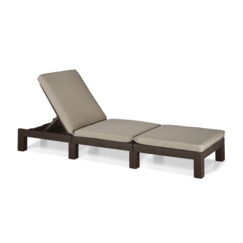 Estructura de ratán de resina color marrón chocolate, incluye cojín de 6 cm de g rosor en color arena. Respaldo con 4 posiciones. 195 x 65 x 22 cm.