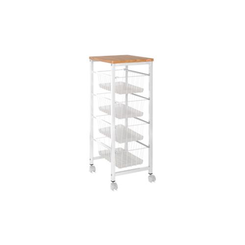 Verdulero de acero con 4 cestas. Sobre madera de aglomerado chapado. Cestas en a cero. 4 ruedas en PP, las delanteras con freno. Bandeja de opaline para interior de las cestas. Estructura en epoxi. Medidas: 30 x 37,7 x 86,7 cm