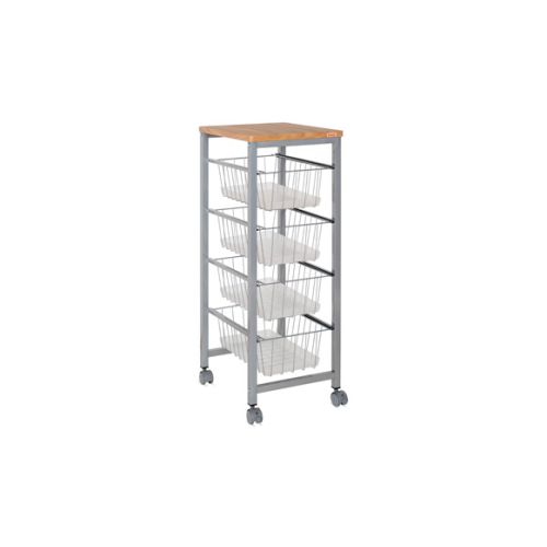 Verdulero de acero con 4 cestas. Sobre madera de aglomerado chapado. Cestas en a cero. 4 ruedas en PP, las delanteras con freno. Bandeja de opaline para interior de las cestas. Estructura en epoxi. Medidas: 30 x 37,7 x 86,7 cm