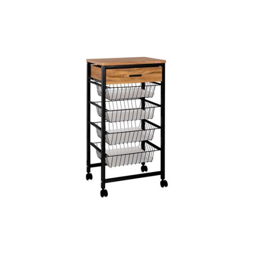 Verdulero de acero con 4 cestas con cajón. Medidas: 43,5 x 33 x 88,4cm. Sobre y cajon en madera de aglomerado chapado. Cestas de acero. 4 ruedas en PP, las dela nteras con freno. Bandejas de opaline para el interior.