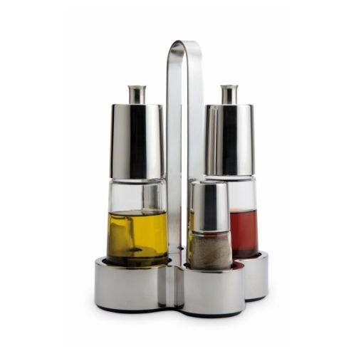 Fabricado en acero inoxidable 18/10. Acabado acero inoxidable. Pulidobrillante. Sistema antigoteo. Capacidad por pieza: 0,2L. 4 piezas: aceite, vinagre, sal y p imienta. Set con una vinagrera antigoteo.