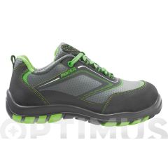 S1P SRC. Corte: Piel serraje afelpado. Forro: SmellStop. Plantilla: Fresh’n Flex . Puntera: Acero. Suela: Antifatiga AirTech PU con resaltes