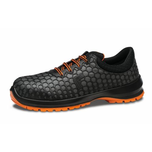 Zapato Piel flor vacuno 1ª calidad 2.2 mm espesor, hidrofugada y transpirable. Certificado S2 según UNE EN ISO 20345. Calzado 'Metal Free' sin componentes metálicos. Cierre cordones. Horma Extra-Ancha. Forro textil muy absorbente y resistente a la abrasión y al desgarro. Collarín almohadillado de alta densidad anti impactos y rozaduras. Puntera Plástica Fiberplast 200 J.Suela inyectada bidensidad directamente de PU/TPU (máximo coeficiente de antideslizamiento). Bandas reflectantes con certificado de retroflexión avalados por 3M.